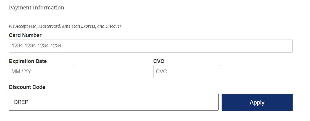 3. Enter the code in the discount code field and click apply. Discount Code: OREP
