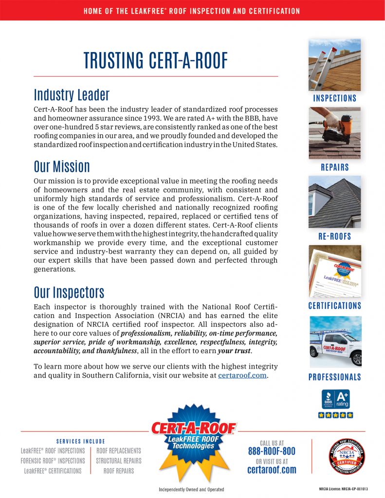 This document is an example of a Company Report Flyer. NRCIA Authorized Company, Cert-A-Roof, adds this flyer to every report. You can use documents to promote your credentials, sell additional services, or highlight other offerings.