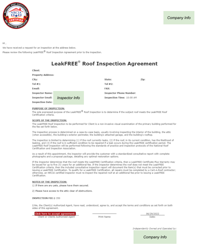 Here is an example of a Pre-Inspection Agreement for a LeakFREE Roof Inspection