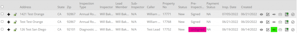 If a client has not signed a pre-inspection agreement, you can resend the agreement again. To resend the agreement go to the Inspections page and open up the property in question. You can open an inspection by clicking the double right arrow on the right-hand side.